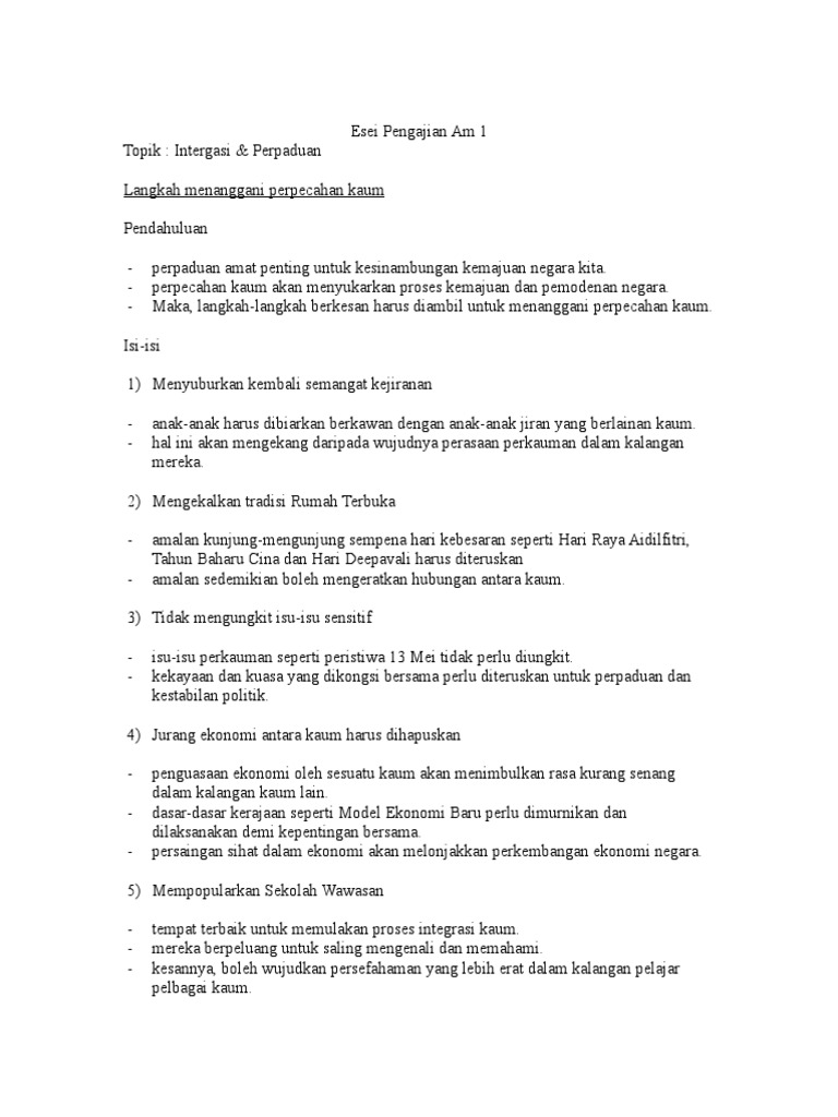 Sehingga tujuan pendidikan dalam mengarahkan peserta didik agar menjadi pribadi yang berintelektual serta ketakwaan yang tinggi dapat terwujud. Semua isi esei telah diberi dan pelajar perlu memilih 5 isi utama sahaja mengikut format skema. Koleksi karangan / esei pengajian am (pa) stpm (1). Mendengar kata integrasi pastinya sudah tidak asing lagi. Sebaliknya, jika di dalam masyarakat tidak ada persatuan dan kesatuan, maka tidak akan integrasi nasional.
