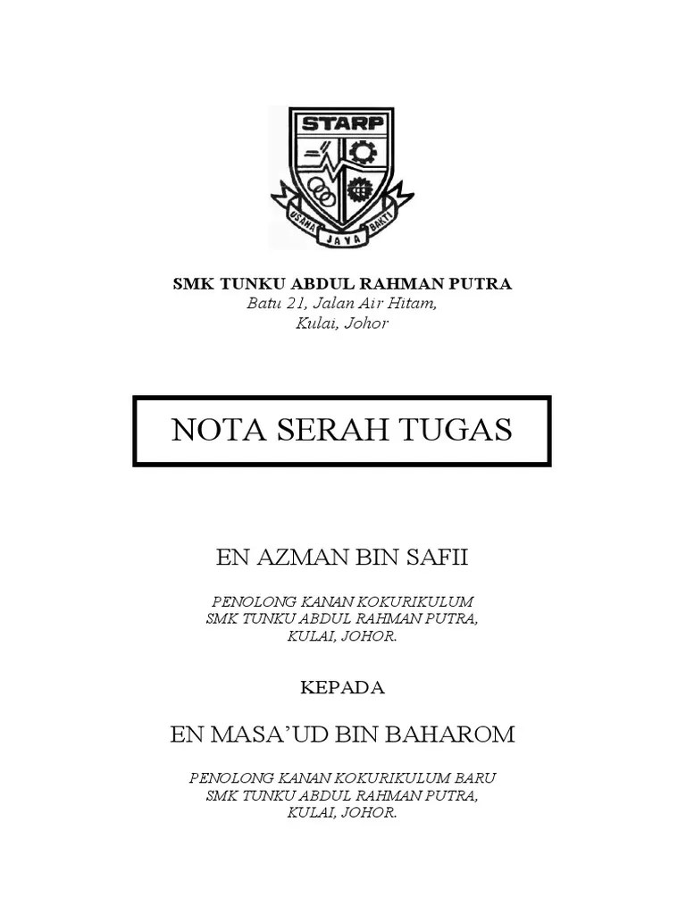 Surat penyerahan dan nota akuan terima nota serah tugas. Walau bagaimanapun masih terdapat sebilangan penjawat awam yang tidak menggunakan format nota serah tugas yang sepatutnya. Setiap proses pertukaran, naik pangkat, atau penamatan perkhidmatan pegawai perlu disertakan dengan nota serah tugas yang sesuai dan selaras dengan panduan yang dikeluarkan oleh kerajaan malaysia. Senarai tugas guru atlamat guru adalah untuk men5a$ai dasar pendidikan kebangsaan ,dpk</b> dan !alsa6ah pendidikan kebangsaan ,!pk</b>& %ertanggungjawab ke$ada kementerian pendidikan 4 pengarah. Garis panduan penyediaan dan format nota serah tugas.